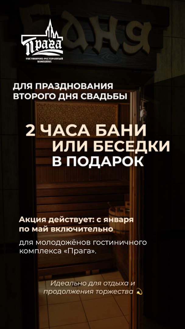 Акция действует с января по май включительно для молодожёнов ГК «Прага». Идеально для отдыха и уютного продолжения торжества.