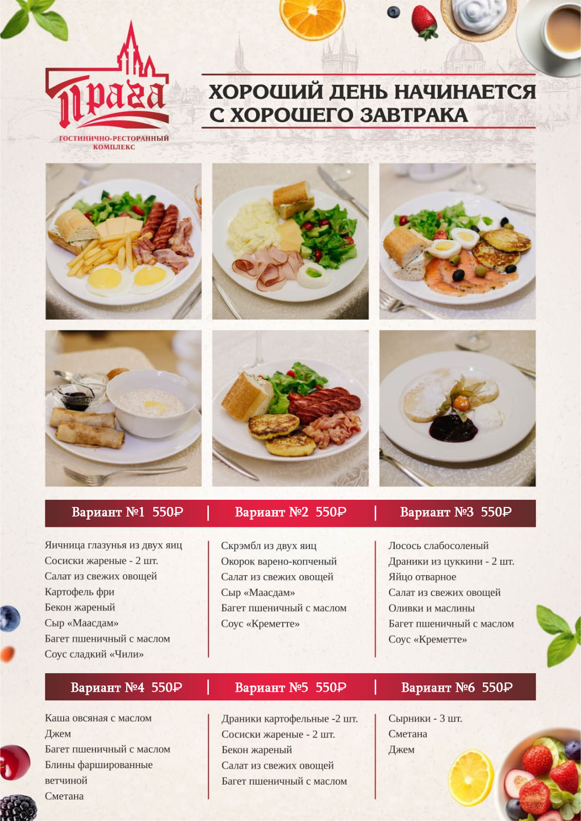 Предлагаем на выбор варианты завтраков. Дополнительно Вы можете выбрать один из напитков: чай черный, чай зеленый, морс. Стоимость одного завтрака – 550 рублей. Завтрак по предварительному заказу по номеру телефона +7 903 947-87-77 (ресепшен)